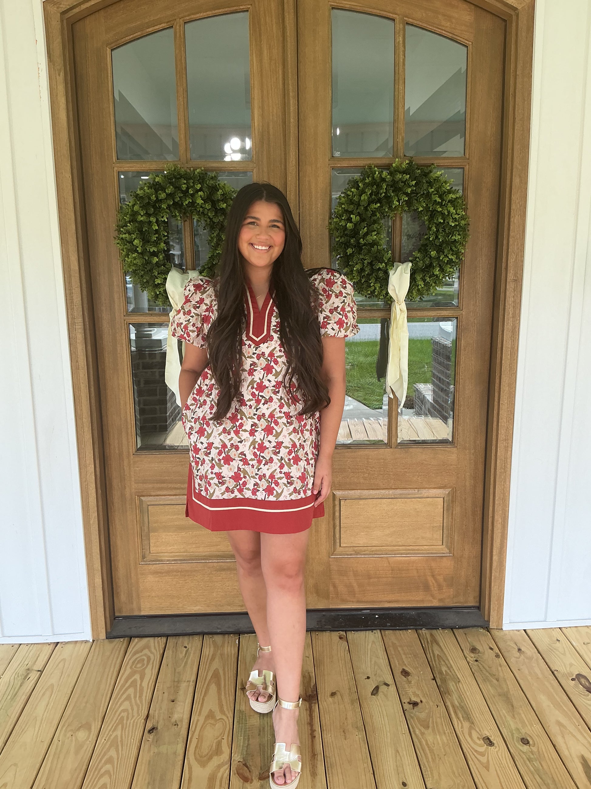 This vibrant floral shift dress is the perfect blend of charm and comfort. Featuring a bold red-trimmed neckline, puff sleeves, and a playful mix of red, blush, and cream tone, its effortlessly chic for any occasion. Dress it up with heels for brunch or keep it casual with sandals for a sunny afternoon stroll.