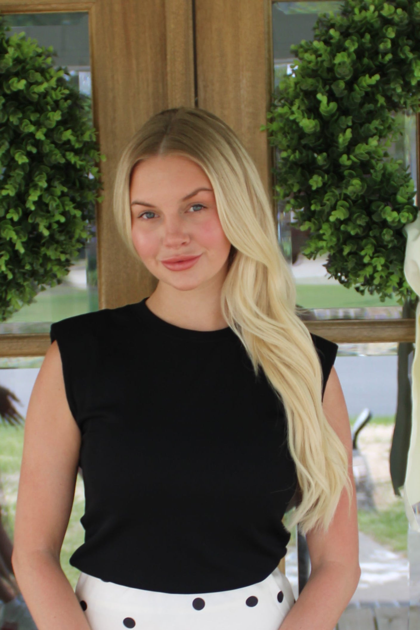 Effortlessly cool and endlessly versatile, this black ribbed tee from She + Sky is a must- have staple for your capsule wardrobe. Crafted from a soft, stretchy ribbed knit, it features a classic crew neckline, a relaxed silhouette, a bold padded shoulders for a modern edge.